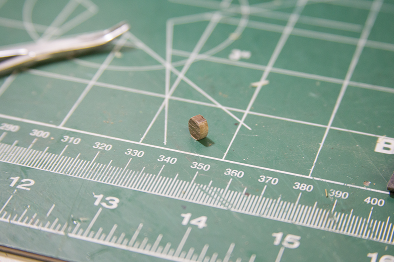 According to Xavier Pastor’s book, the two sheave pulleys that extend from the crow’s nest were used to move and/or load things onto the deck. To create them, I needed to build small pulleys from scratch. Similar to the sheaves on the top of the masts, I started with a 5mm block, rounded the edges and drilled out the center.