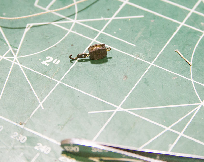 I then used some scrap pieces (a small deadeye, an old eyelet, and brass attachment) to create the rest of the pulley. I then rigged it through the sheave, coiled a rope, and left it hanging for the crew to use when needed