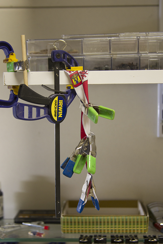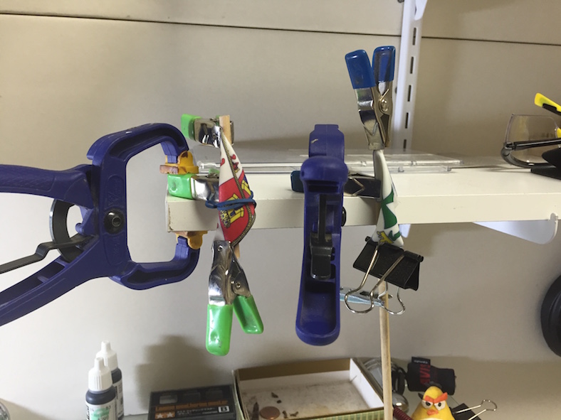 The trick then became how to make them seem less “stiff”. First, I soaked them all in the thin white scenic glue mentioned above. I then used various clamps and rubber bands to get an approximate shape of them ‘drooping’ or hanging with folds and let them dry.
