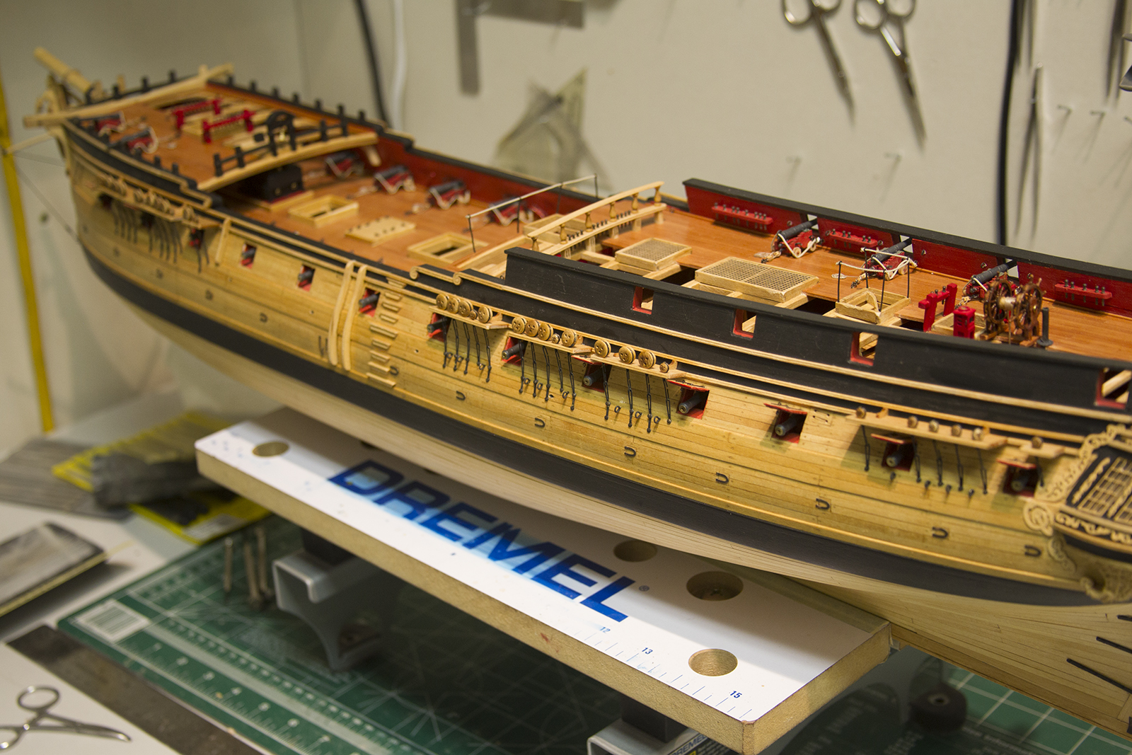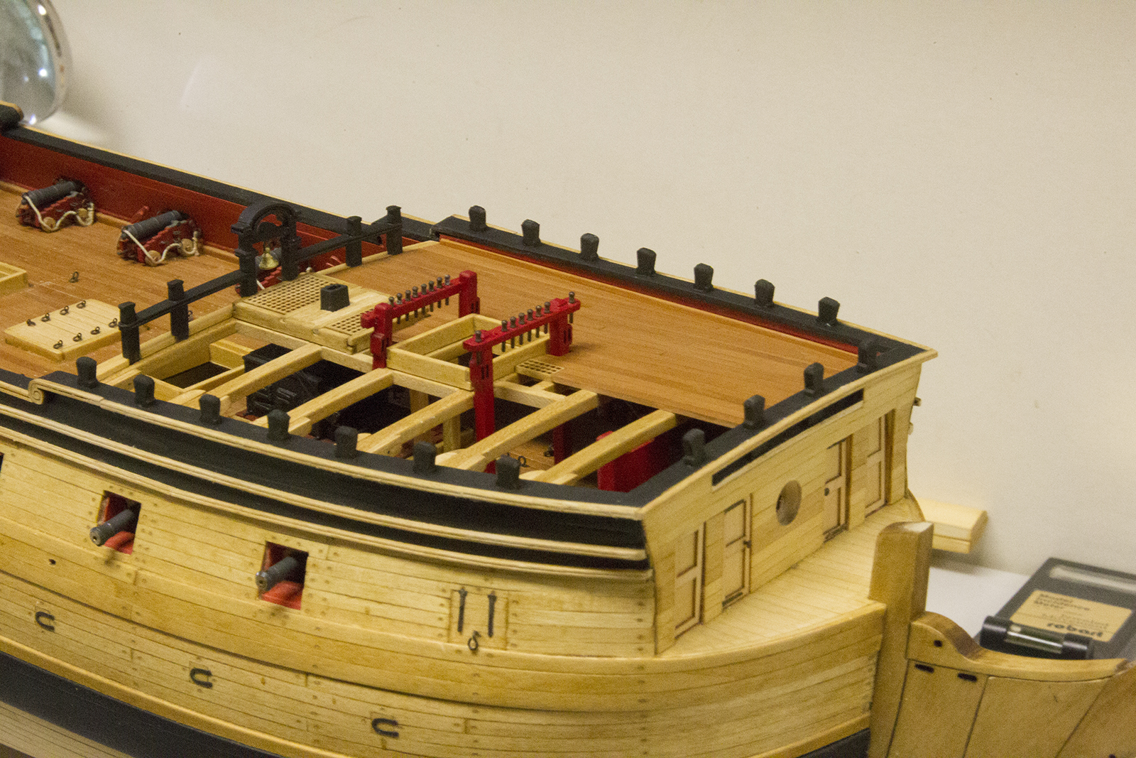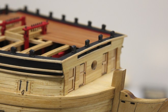 The alternative, if I still wanted to rig gun tackles, was to only rig the gun tackles on the accessible cannons on the open lower deck and open upper deck and leave the rest unadorned. I really didn’t like the idea of that kind of consistency.