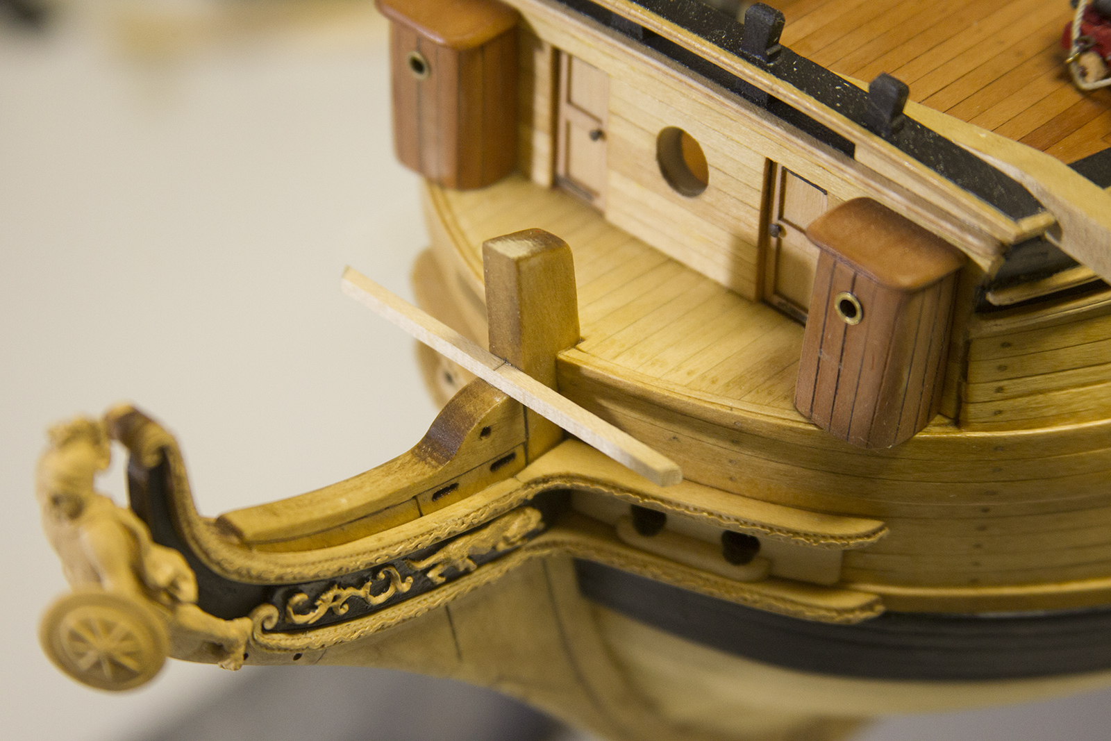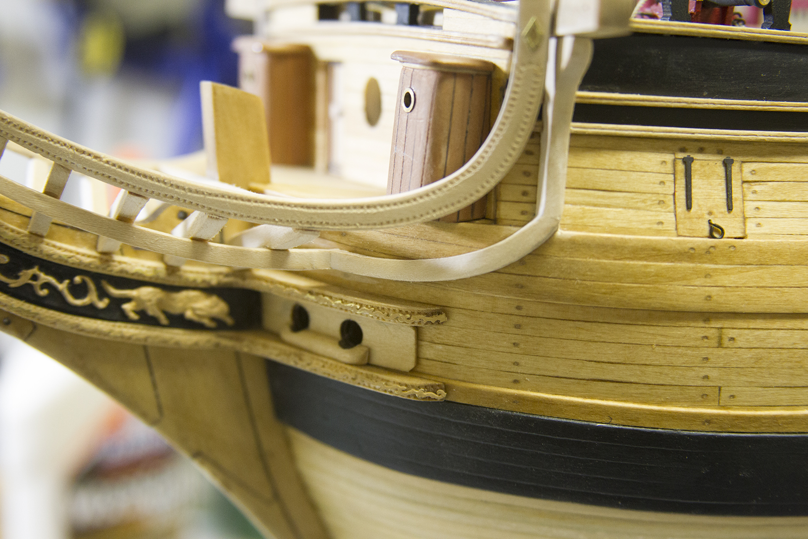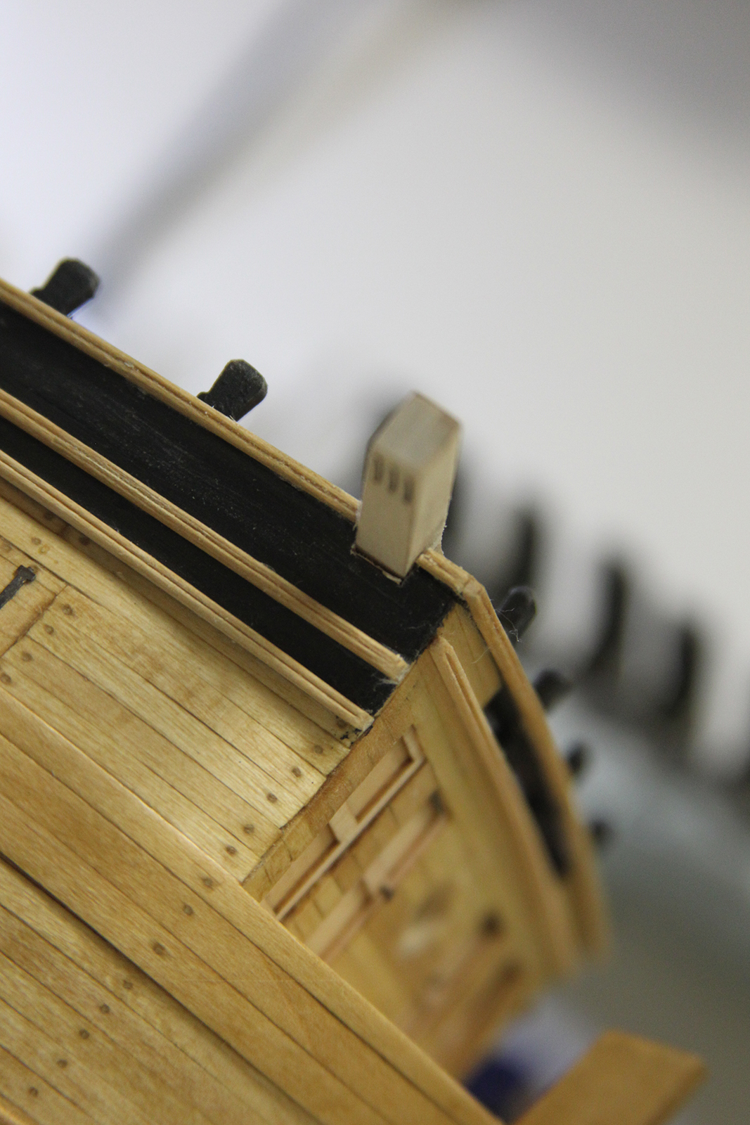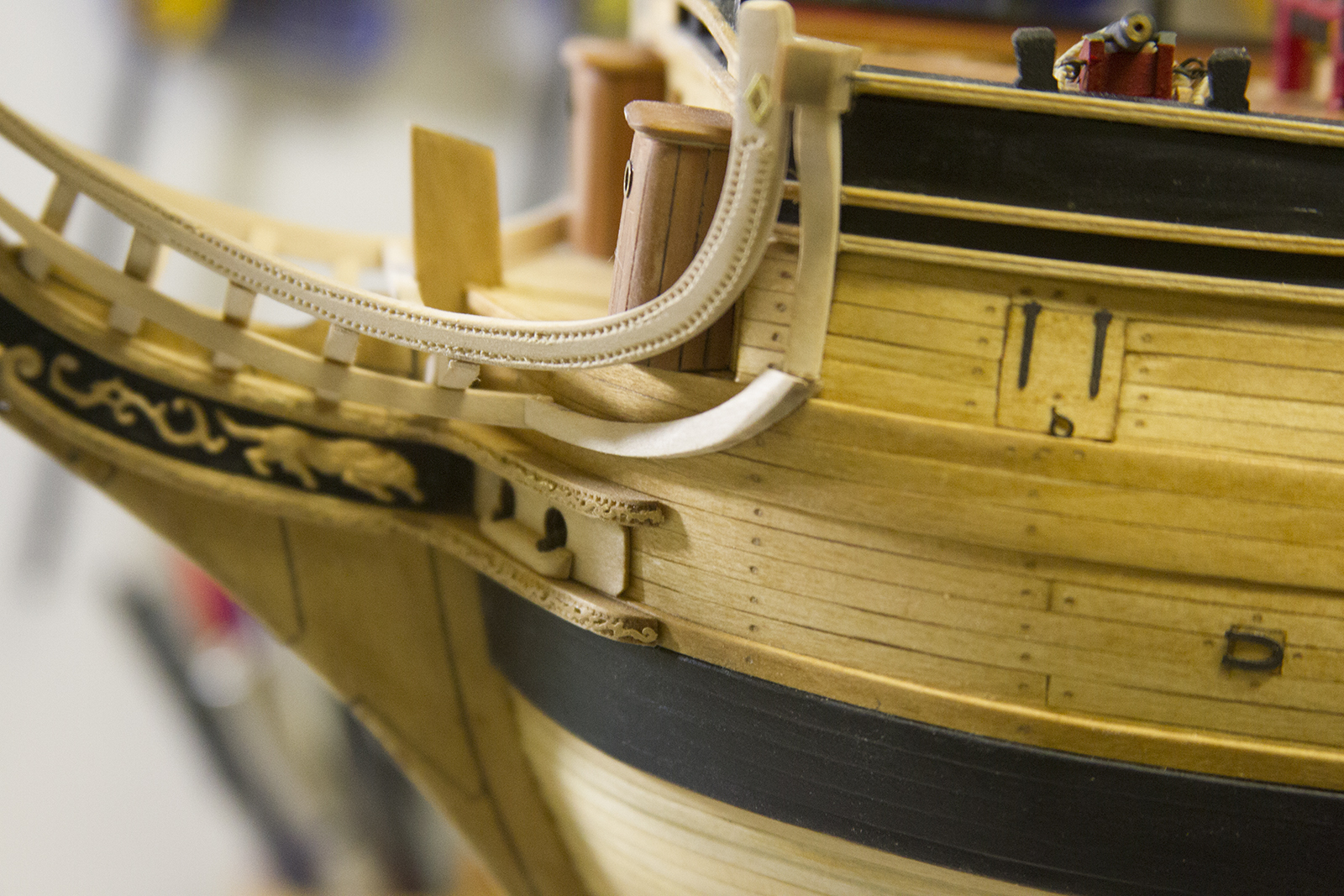 Finally, the birthing rail (small metal railing along the bow) is added.