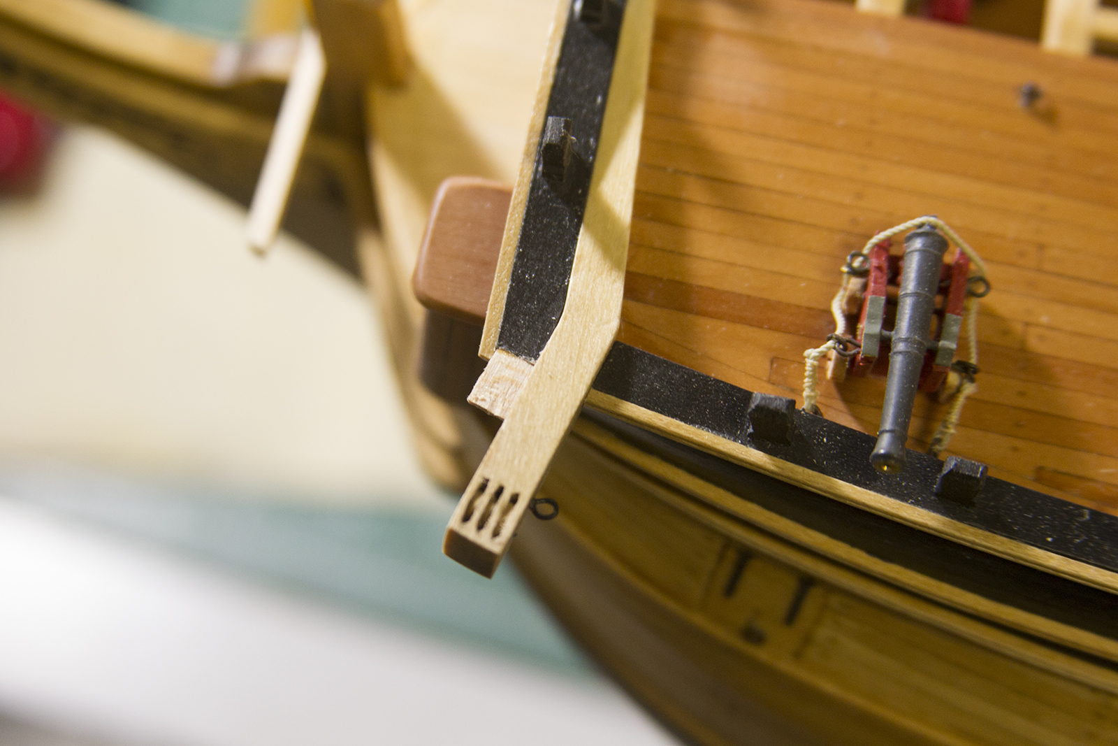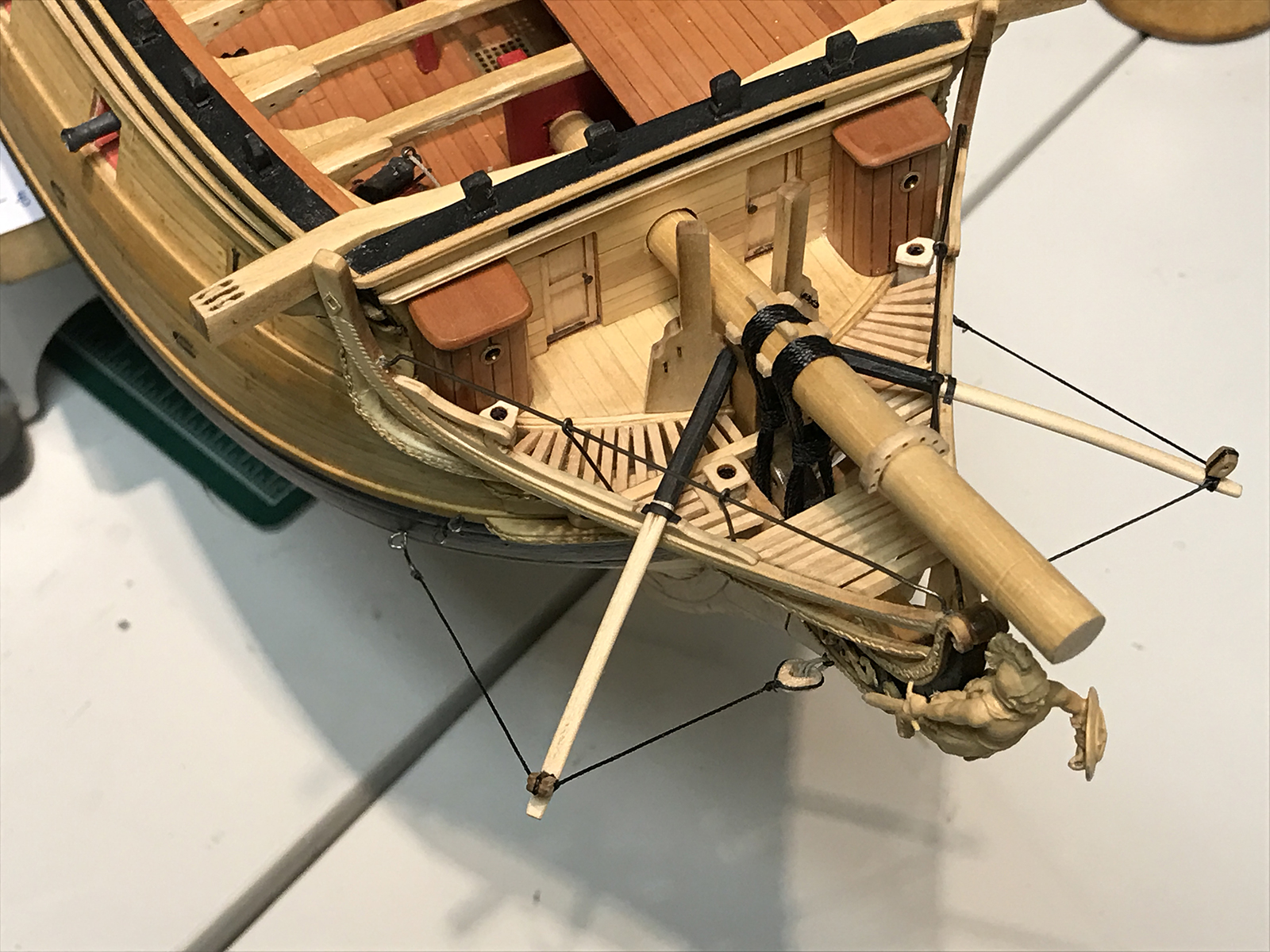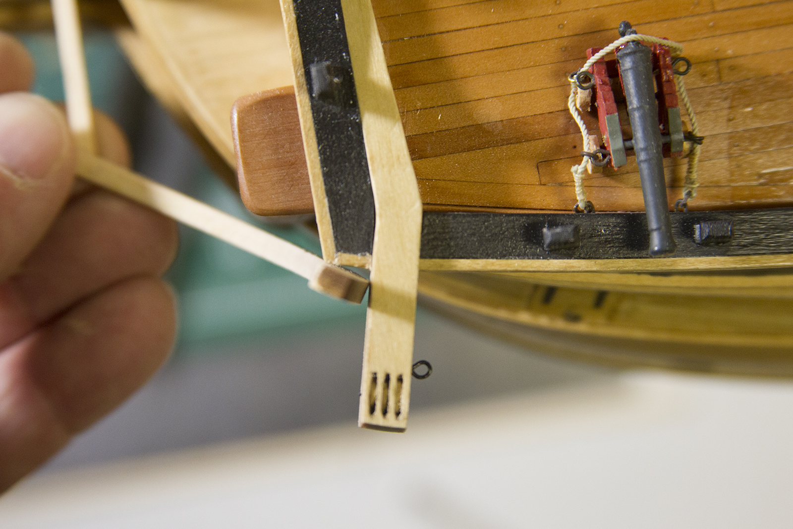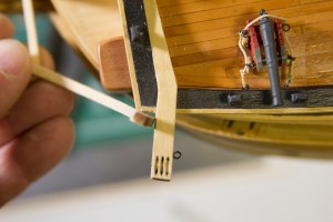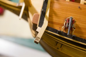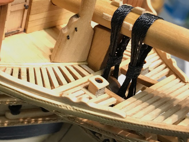 Finally, the rudder is added and mounted with more blackened strips of wood. A couple of the final steps include the rudder handle as well as a traveler bar at the rear of the ship – both constructed with 22 gauge black wire.