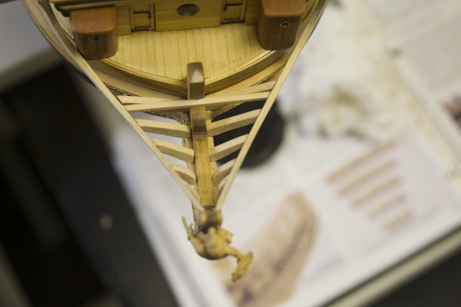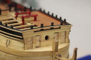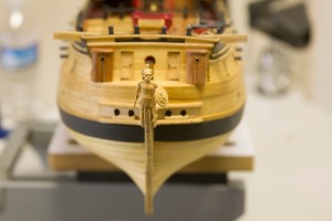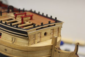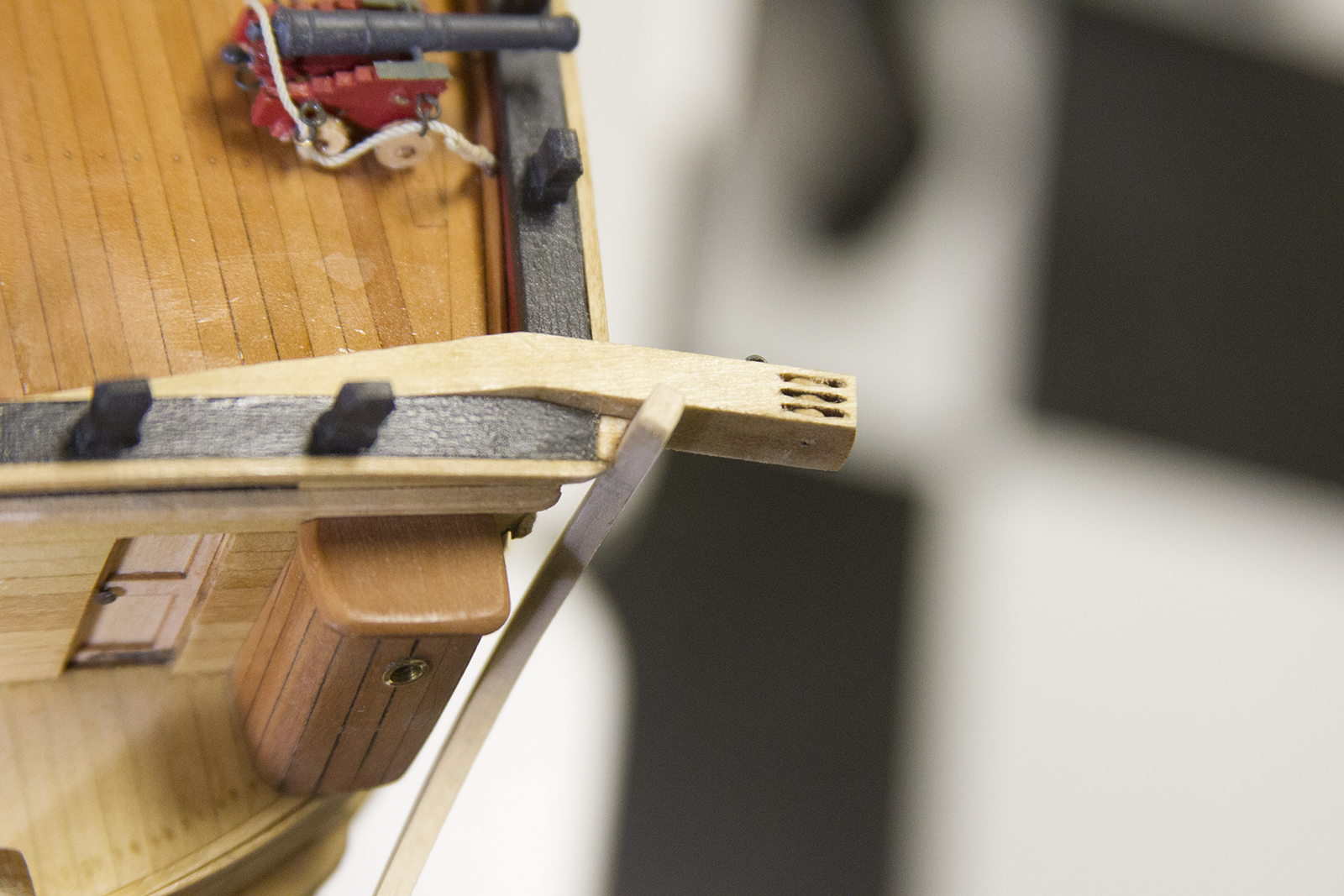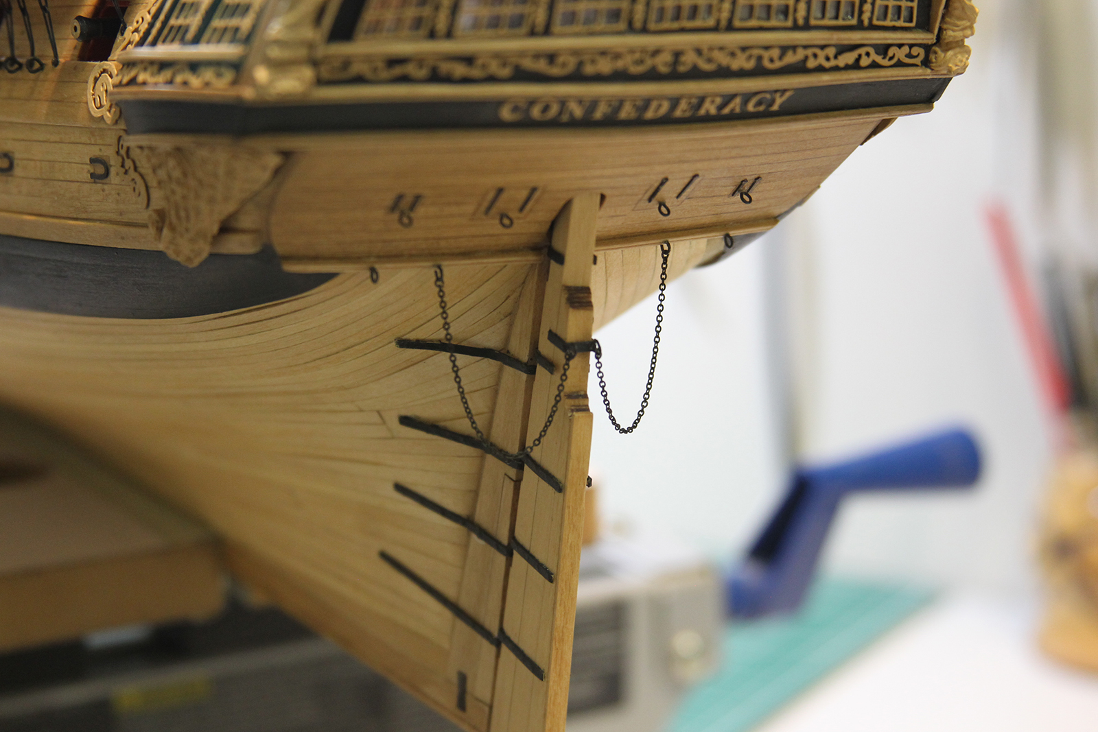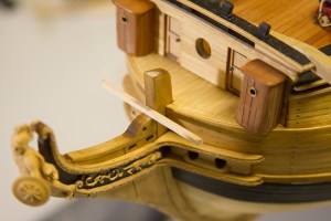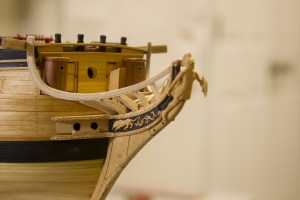 Finally, the rudder is added and mounted with more blackened strips of wood. A couple of the final steps include the rudder handle as well as a traveler bar at the rear of the ship – both constructed with 22 gauge black wire.