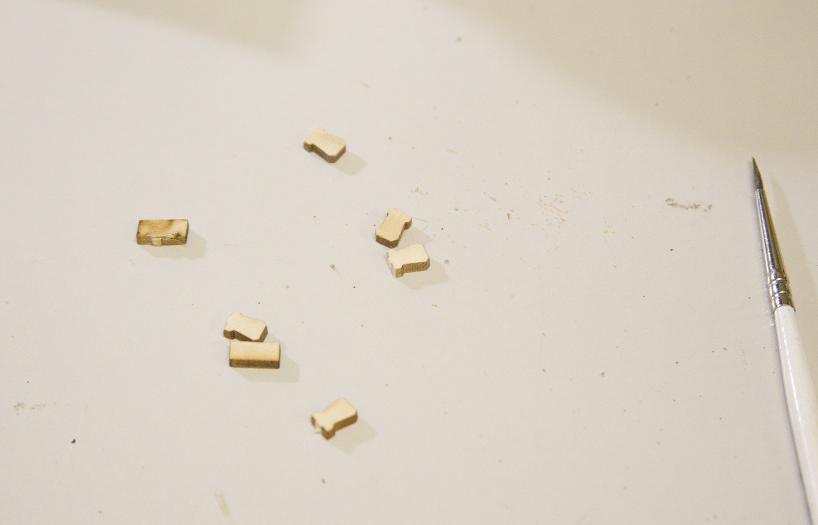 The fore and main masts are 13mm dowels, with the mizzen slightly smaller. Each mast is fitted with a set of either four or six cleats. I had a handful of cleats left over from another project, so it gave me a chance to use my snazzy new airbrush. Worked pretty well, except they all needed to be taped down – after my first attempt at ‘airbrushing’ blew them all off the counter and had me on my hands and knees picking cleats up off the floor. The color was a combination of Vallejo Airbrush colors light brown and yellow ochre.