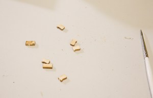 Hinges and eyebolts are cut from the metal photo etched templates and blackened. Usually I’d use a mix of “Black-en It” to patina them, however it ended up being much easier to just paint. Two hinges and two eyebolts are added to each gun port lid.