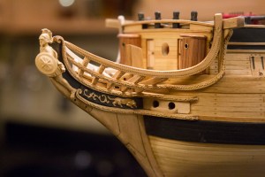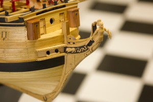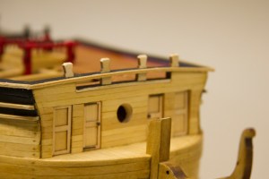 I really struggled with the decision of either closing in the waist with the Swiss Pear that the deck was planked with, or closing in the waist with the lighter wood. Ultimately, I decided on the lighter as a means – artistically – of bringing the two very distinct colors together. Knowing that the cross beams and the small boats would be lighter, I wanted to tie it all together. I figured that if everything was the darker pear, and the beams and boats were light, it’d just be a bit too much of a contrast.