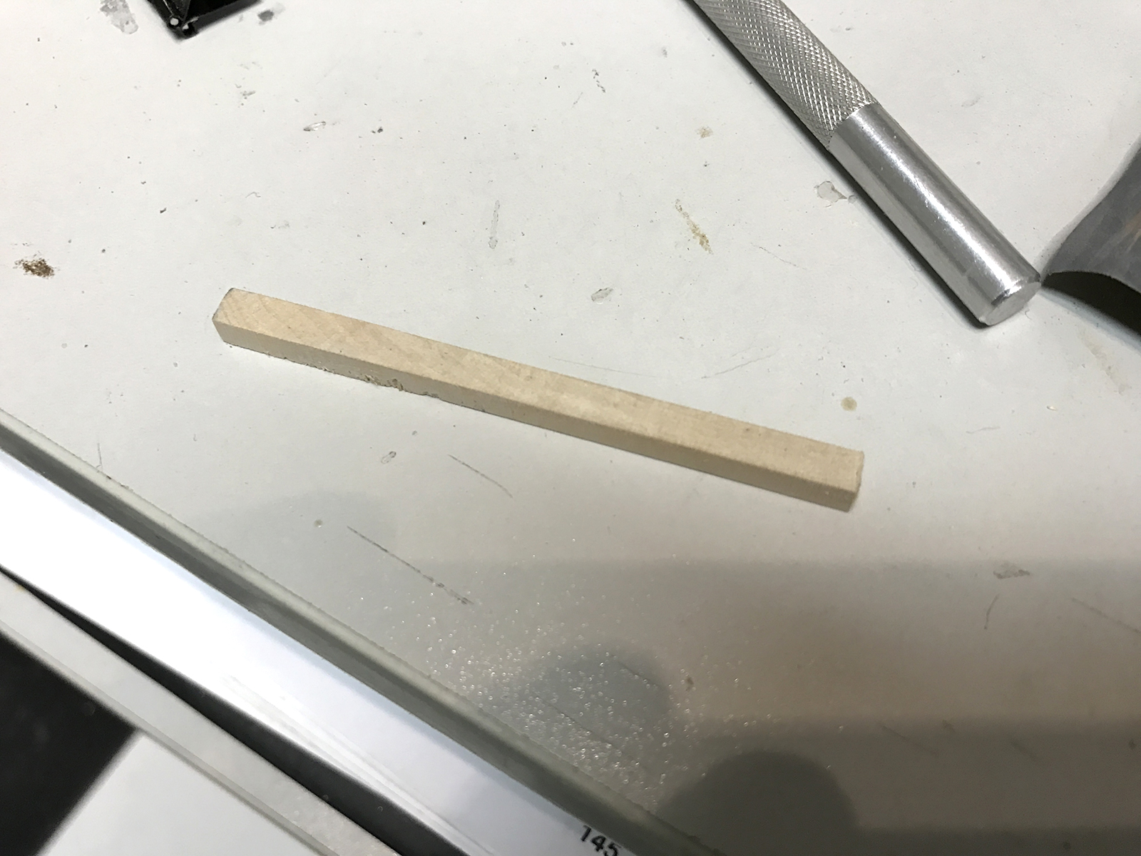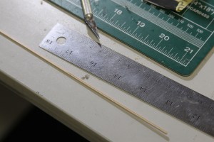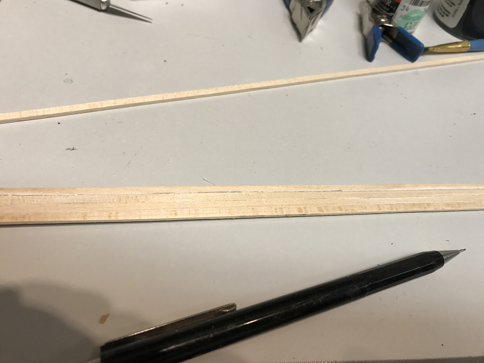 I matched the wood, then scored it using a metal ruler and an X-acto knife. After a couple of attempts, this gave me a straight light down the center of the wood that I could use as a guide. I then dug out a bit more of the wood and scored it deeper using my sharp end tweezers.