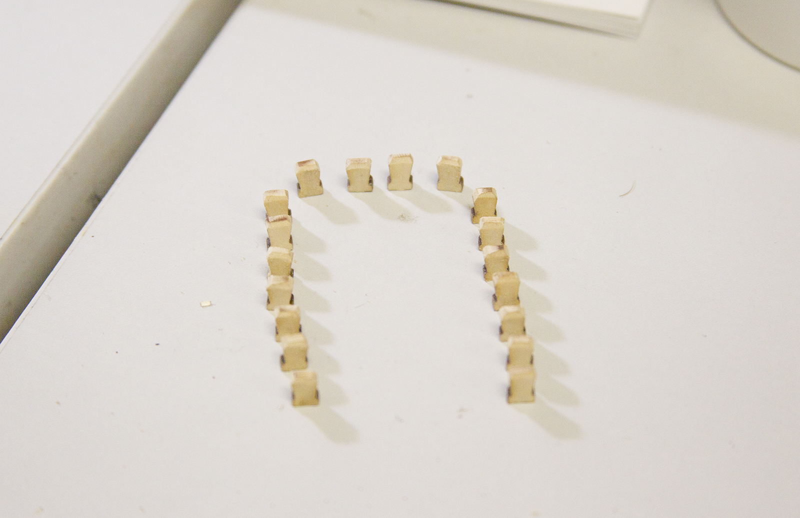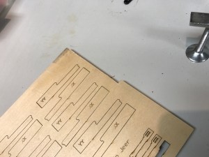 First, the two sides of the halves of the jig are glued together to form slots that are precisely spaced. Small laser cut blocks are detached and sanded. However, as Chuck insists, the sides must remain precisely measured; so only the top and bottom are slightly sanded to get rid of the laster cut char and fit into the jig snug but not tightly.