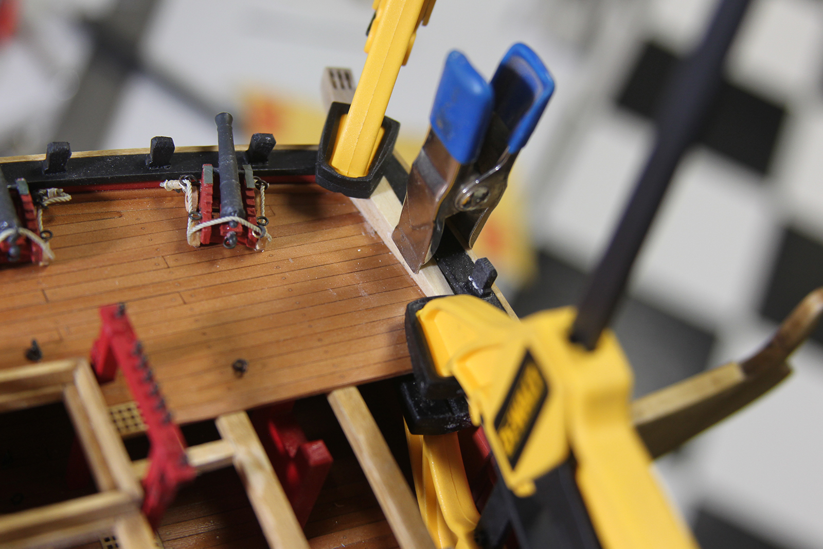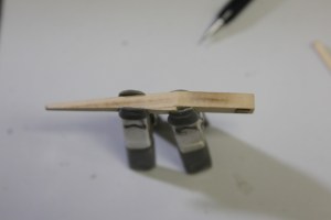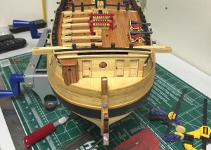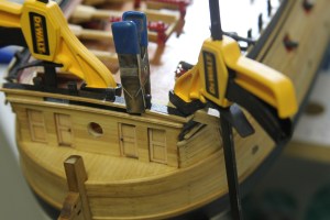 Finally, the catheads themselves were carefully glued into place and clamped until they dried. Since the port and starboard sides of the ship were not exactly symmetrical, it took some sanding and fitting to get the catheads to look as even as possible.