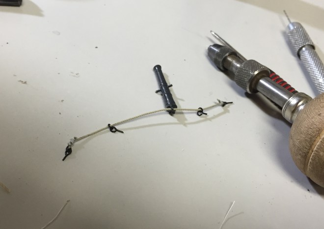 So instead, I settled on just rigging the train tackles. It gave the cannons a bit more rigging, which is what I wanted, and also incorporated the eyebolts mounted behind each cannon, which up until this point seemed to be begging the question “what am I here for?”
