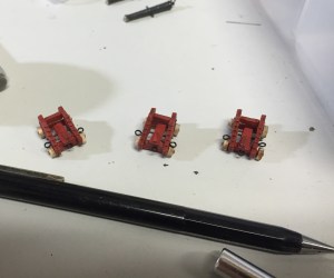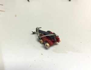 Each of the four skid beams is held in place using a small crutch. The instructions call for each crutch to be made from cardstock, however once again I used small strips of metal – as the patina’d metal is much more natural and authentic looking to me. So I cut up some brass, bended it to fit, then drilled holes in the bottom to fit a brass nail. I blackened all of it, then mounted all the skid beams.