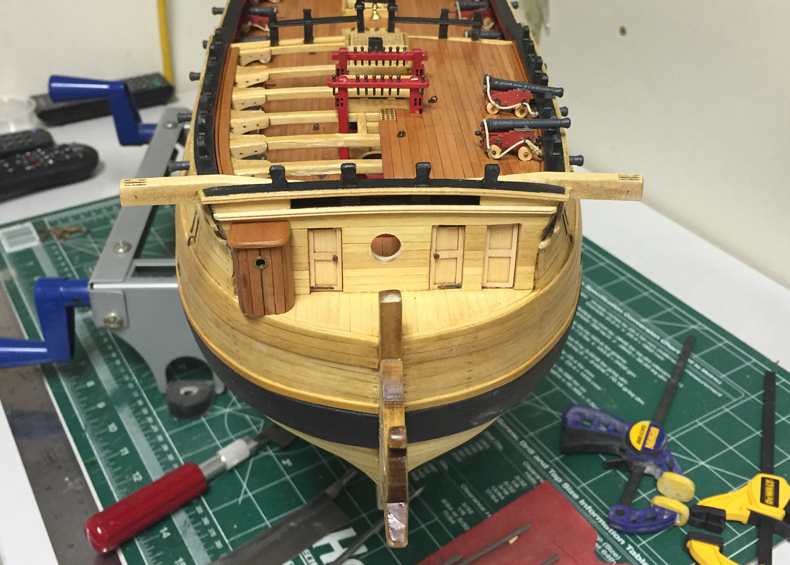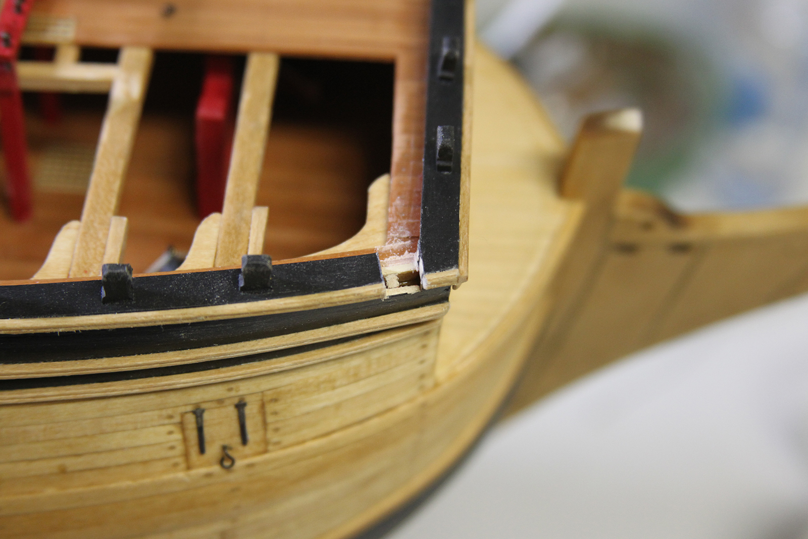 Now, I wasn’t sure if I should taper the head rail, or if I should taper the ship. I was hesitant to do either, so my solution was to add a little bit of filler, then sand it to fit as nicely as possible.