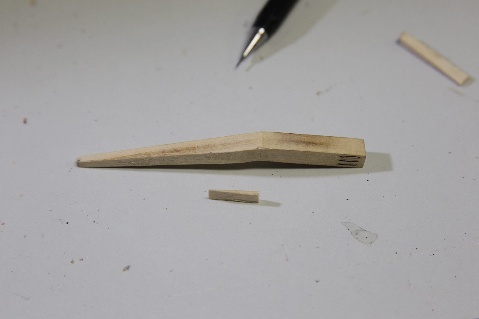 T he bottom of the cathead doesn’t quite fit the edge where the deck meets the side of the ship. So, a smaller wedge is cut and glued to match the edge of the deck where the planking and the bulwarks meet.