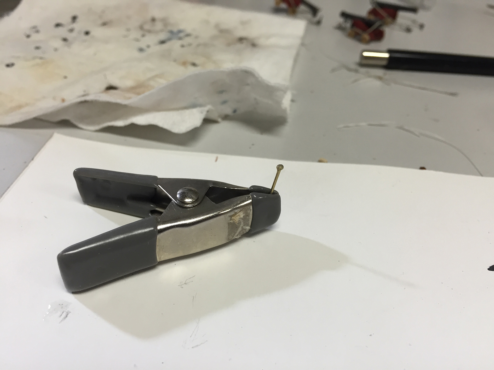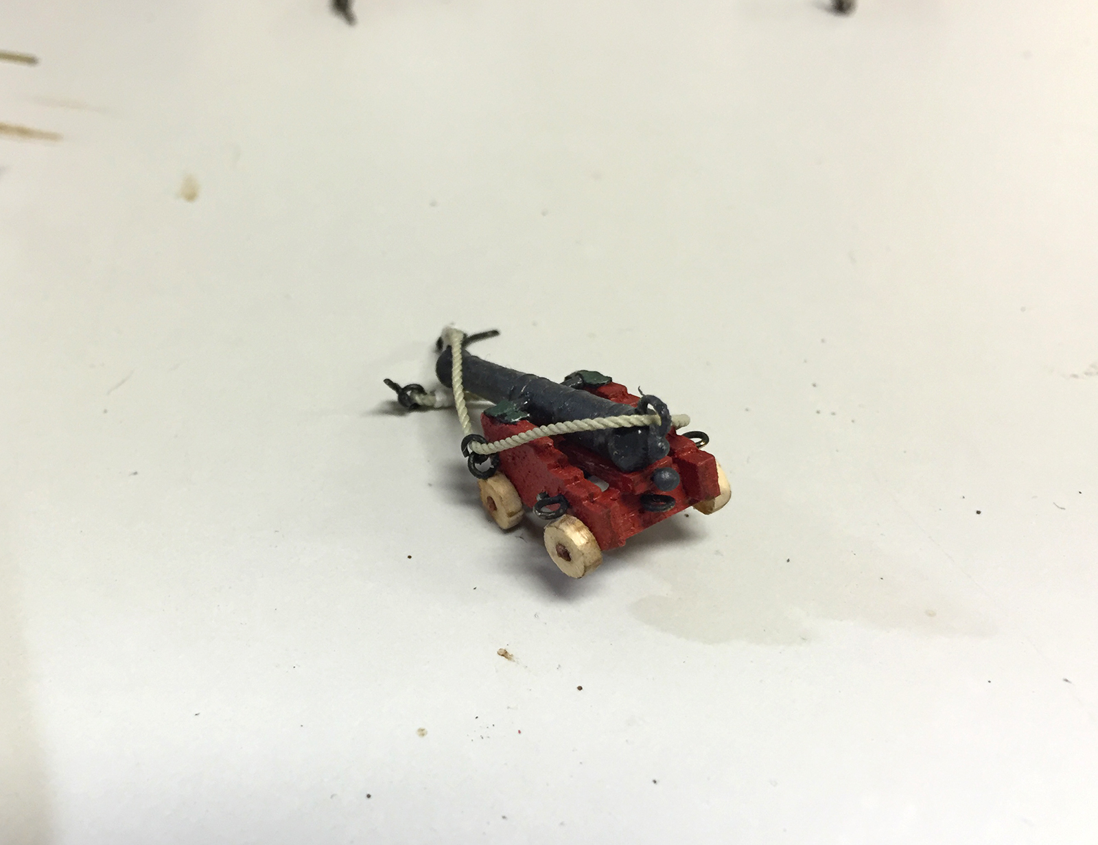 The small rings were bent each by hand with 28 gauge wire, then blackened and attached to the rigging and cannons. Each cannon was fitted with it’s own rigging ring. This part was a lot more difficult than I anticipated. Glue doesn’t hold well to brass, so i had to drill initial little holes to make the placement work.