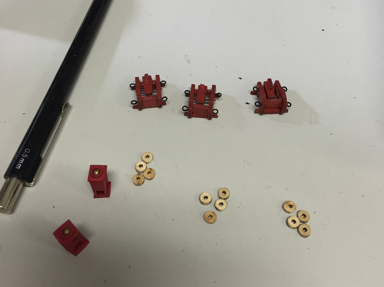 So I decided to add a few more of the ships cannons. To that end – even though the plans call for just four six pounders, I wanted to fill out the upper deck a bit more – so I ordered a few more brass cannon from Chuck and set to work added some guns and putting together some carriages. Of course I referenced Augie’s hard work so I could replicate as closely as possible. Obviously I didn’t want the additional guns to look any different from what he had on deck already.