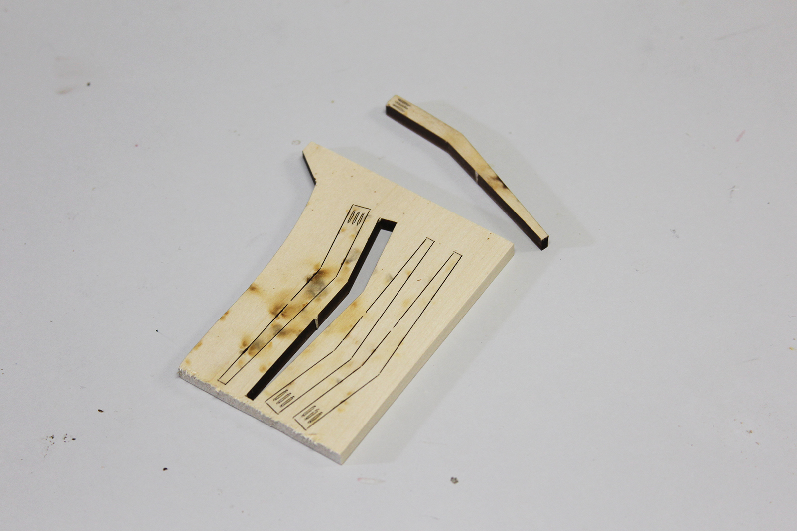 First, the catheads themselves are cut out of the laser-cut molds, and shaped. A bit of the bottom has to be wedged off to match the slope of the deck.