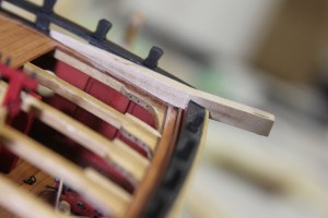 In keeping with my earlier idea to bring the center of the ship together artistically with the deck, I used Swiss Pear for the cap rail and moulding – the same wood used to plank all the decks of the ship. Obviously, the Swiss Pear is about a million times more dense than the stock basswood, so I had a number of failures.