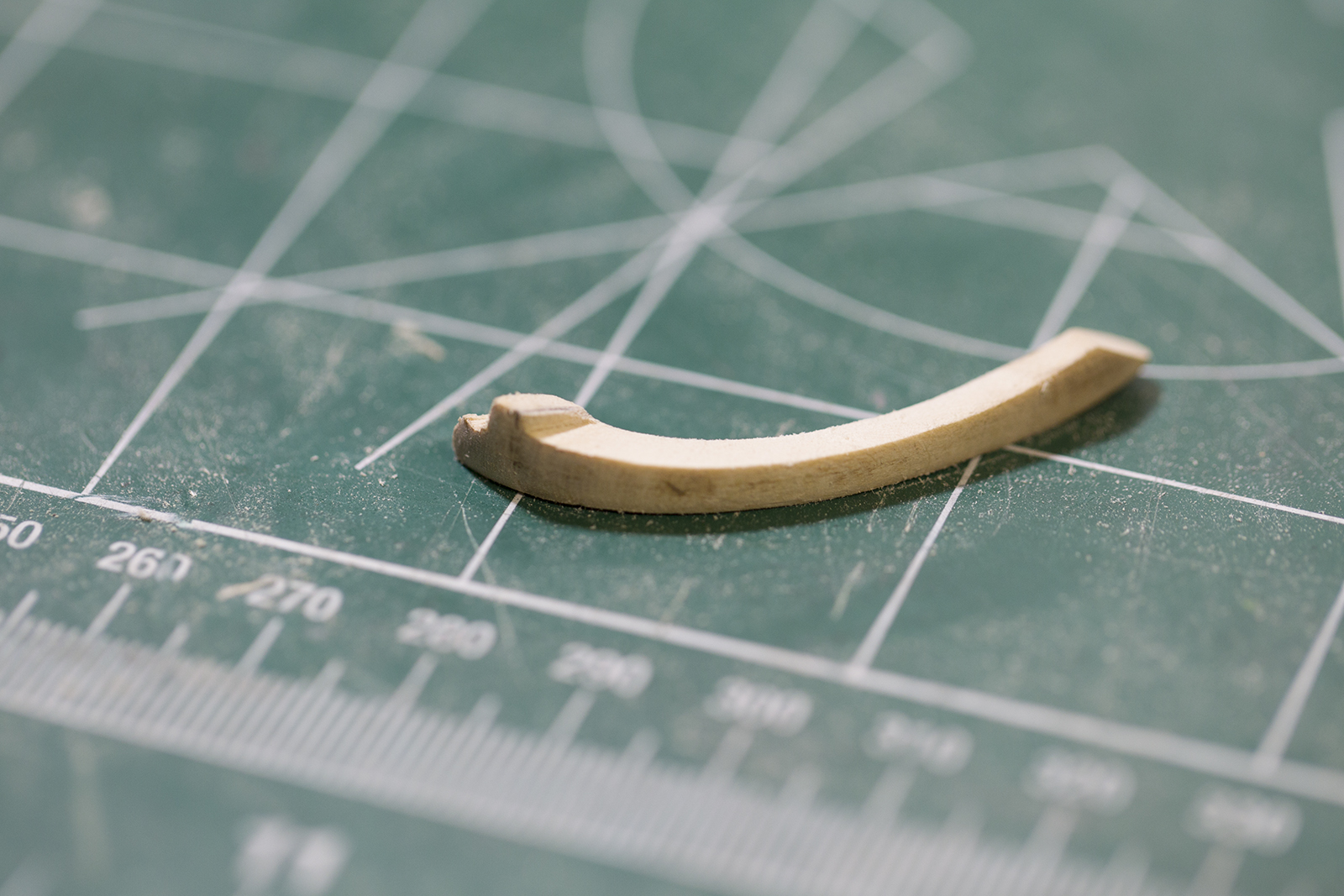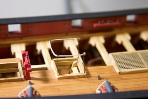 The pinnace does not have a mast, so there’s no need to form the metal rings that hold the mast or a smaller bowsprit, nor does it require a windlass. However, the pinnace does have two sets of rear seats. Each of the rear seats, as well as the middle thwarts, are all notched out to fit snugly against the frame. Then, support knees are carved out and added.