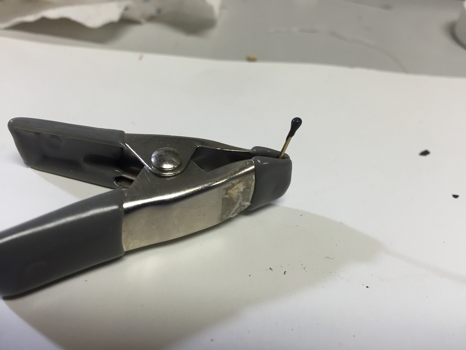 Now, one part that threw me, and I couldn’t find reference to in Augie’s log – was how he created the knob/handle on the stool bed. So I took a nail, added a glob of super glue, then painted it. I don’t think it’s noticeably different from Augie’s work, so I’m pleased with that.