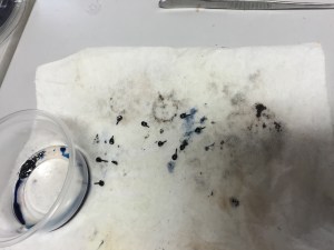 First off – the paint had not been used for a long time – since Augie had built the deck and bulwarks. So most of it was dried beyond use. Rather than try to make an exact color mix – which I felt was likely impossible – I decided to reconstitute as much of the paint as possible using water to dilute and a dremel and old bit as a high speed “stir stick.” Not only was this messy… but it was not super effective. The result… the red painted leaked and seeped into the sides and cracks of the wood of the gunport lids. *Sigh*