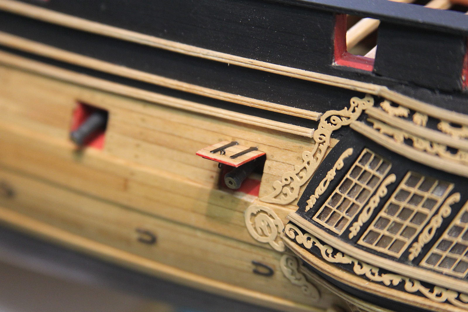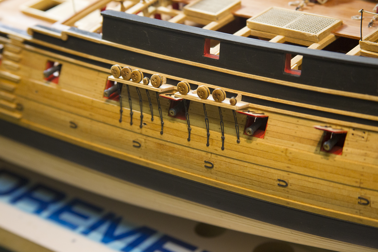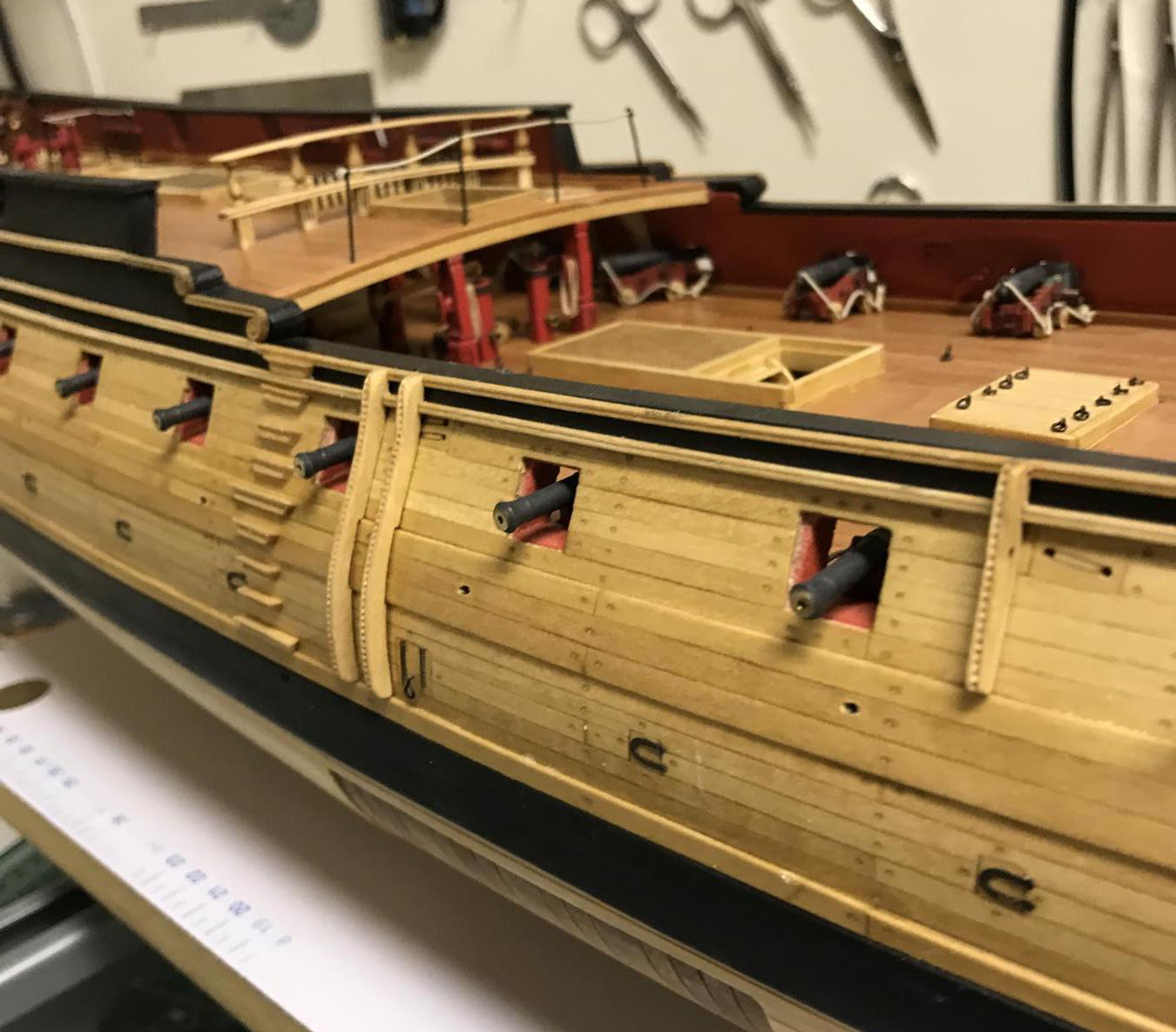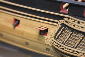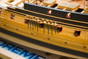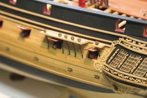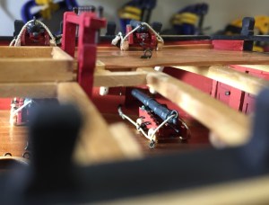 It was still challenging of course to rig the cannons that were on the second deck beneath the openings, but it wasn’t impossible. While it would be inaccurate for cannon’s to have train tackle (which is only used when the cannons are in operation) and not gun tackles – overall, I’m pleased with the look.
