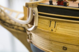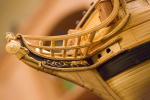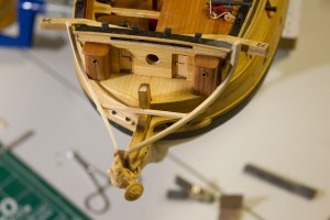 Not only does this provide for an interesting level of accuracy, but also gives her a little variety. Rigging the anchor to the cathead means manufacturing a rather large pulley with a hook attached, then drilling out the sheeves of the cathead itself. Overall, I’m pleased with the look.