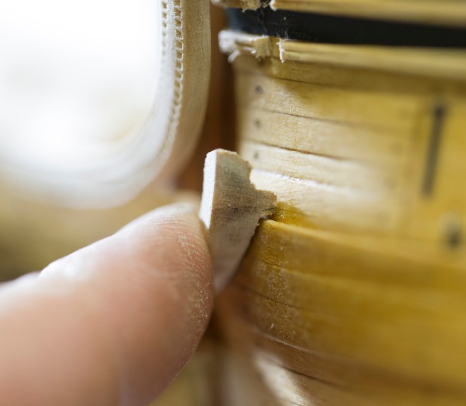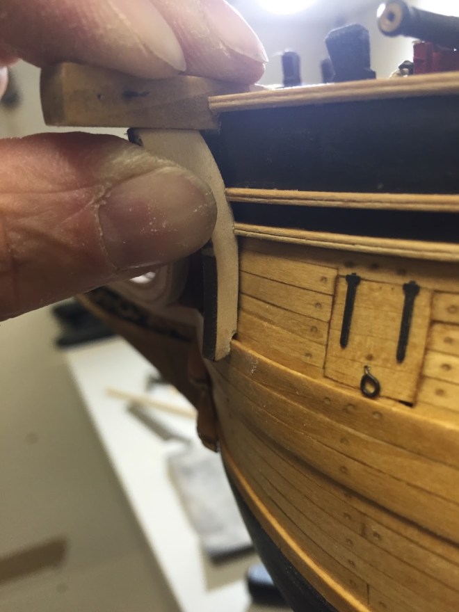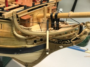Next up is the bow of the ship, and firstly the catheads. Although this was a pretty macro process if you will, the catheads needed to be fitted perfectly snug, and it involved cutting out a portion of the bulwarks – which is always a bit nerve-wracking.