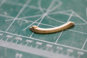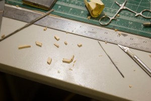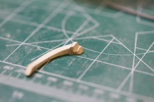 After the longboat is planked, it was time to pull out the bulwark centers. MAN what a sketchy job that was. I tried ‘filing’ off the edges (*as recommended in the instructions) with my smallest needle file, and that was a pretty quick failure. Then I sliced a tiny bit at a time using a super sharp X-acto knife. A little bit more success, but still difficult. It took about two thousand delicate slices to get through. So finally, I put a super thin blade on my Dremel, put it on it’s highest speed, and cut through the edges.