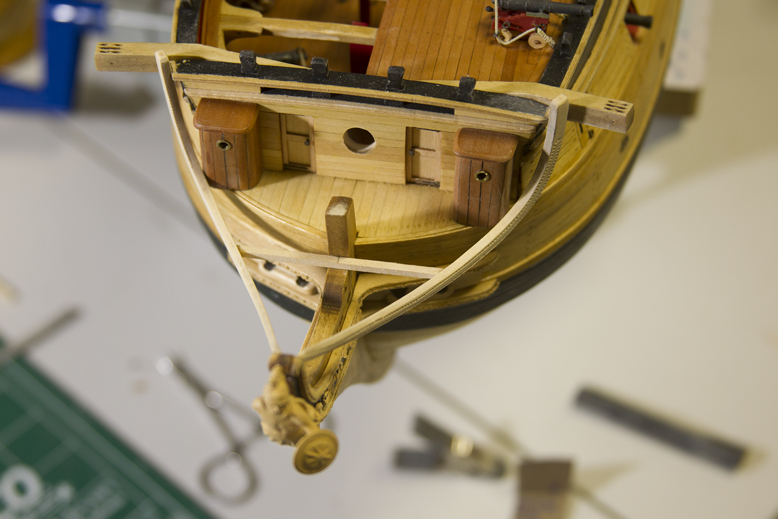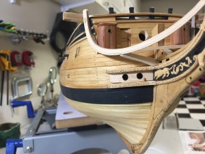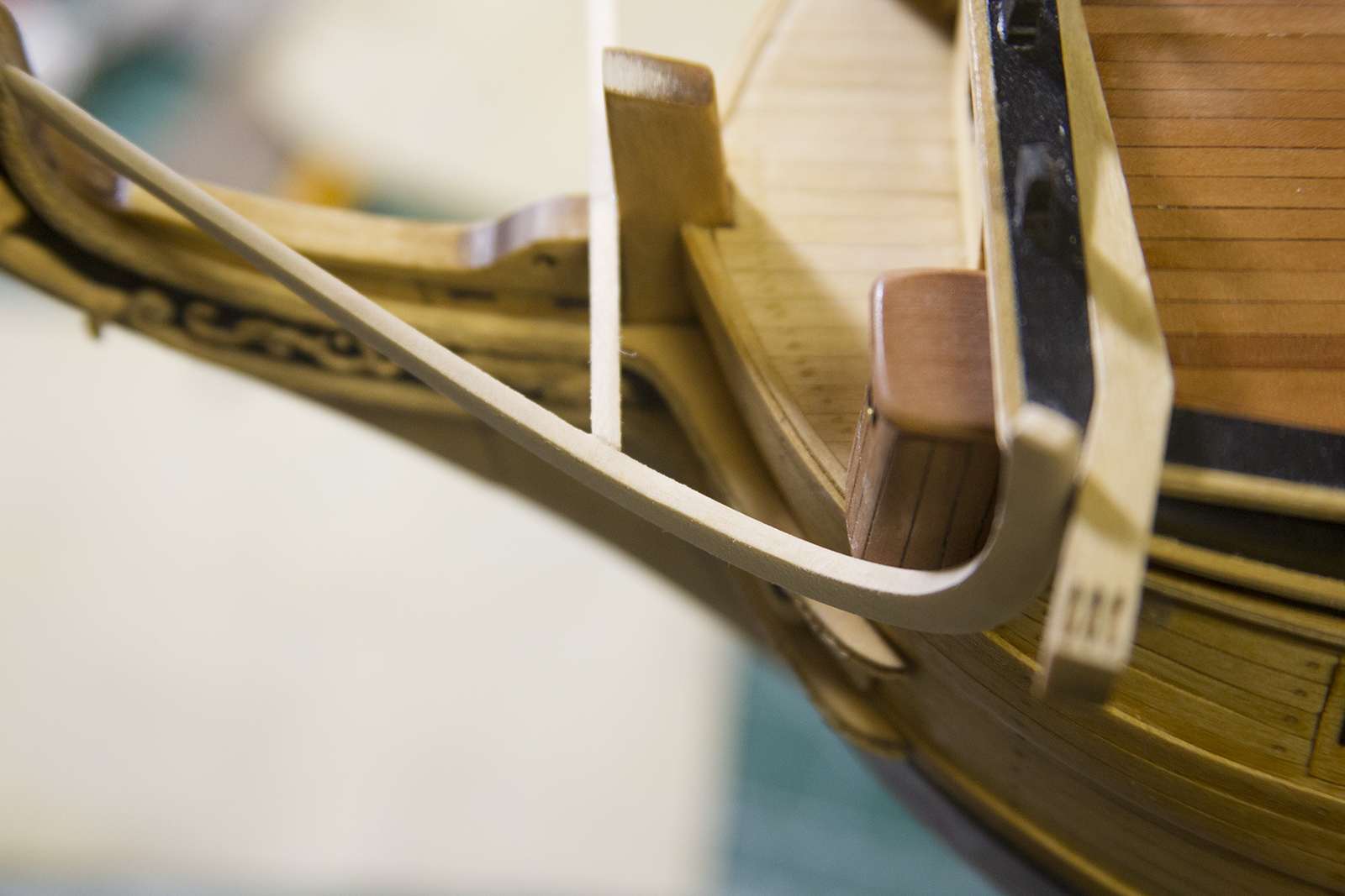 No alternatives for the photo etched carved strips, so they required some careful painting. I fitted them first to get an idea of what part of the bow needed to painted black, then did more painting.