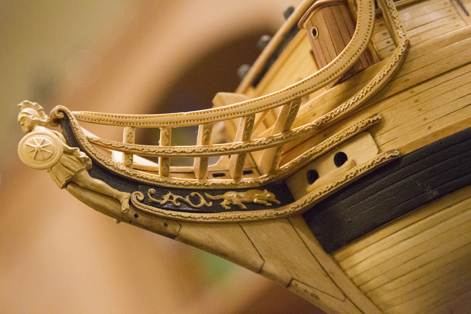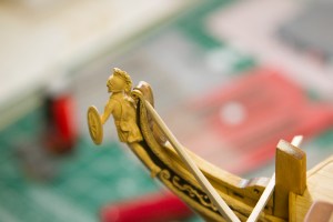 Next up, the cheeks, hawse holes and trailboards. Before I got started I did some fitting and measure, and prepping the figurehead etc. The first problem I ran into was paint color. The rear decorations and etchings of the ship were done is straight “wood” color from Testor’s Model Master line. Although it looked good, it is considerably darker than the natural stained color of the hull, etc. I liked this very much, as it made the details on the transom really pop. However, when we get to the bow of the ship and painting those etchings and even the figure head that dark – it just didn’t look right.