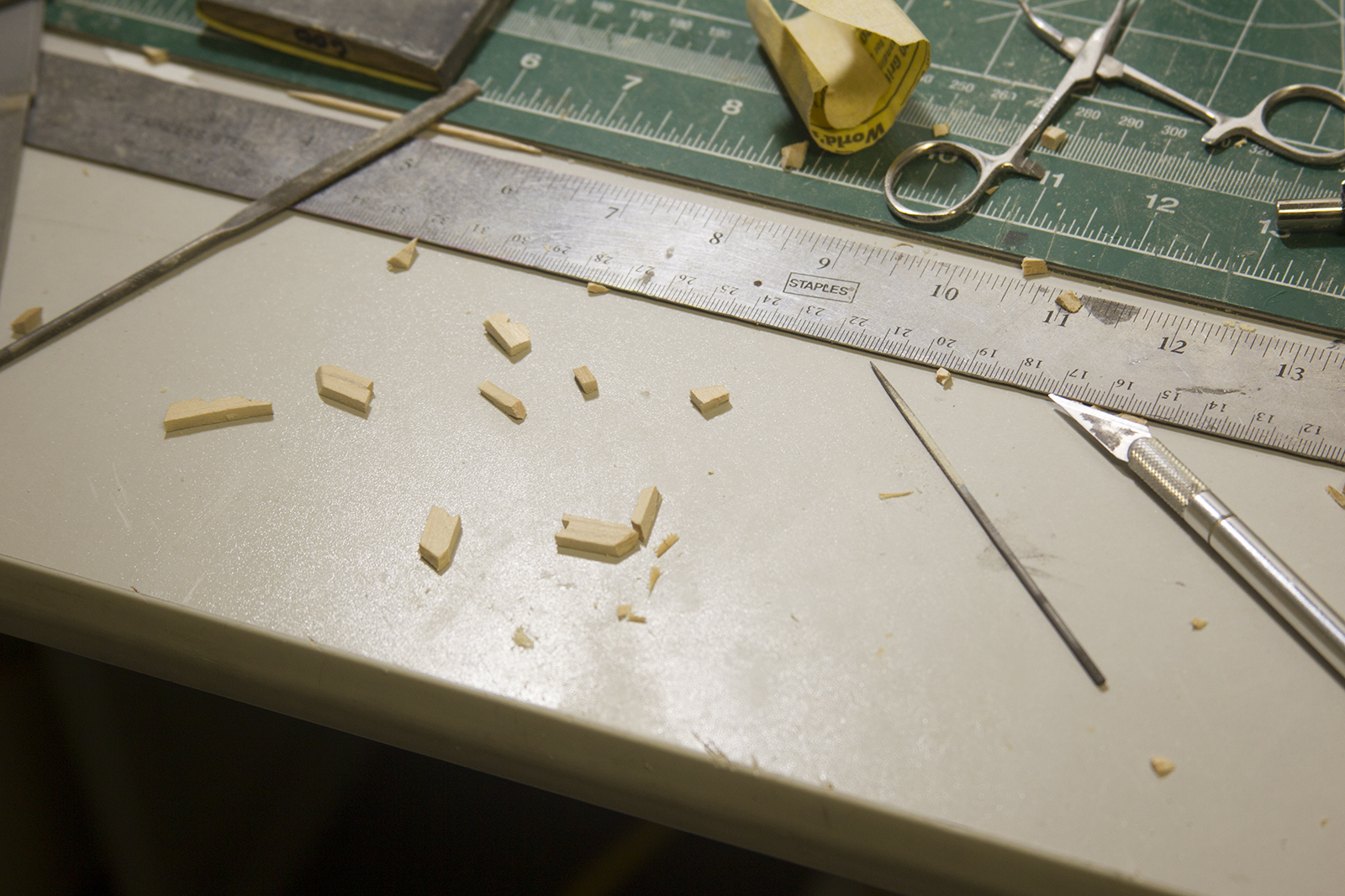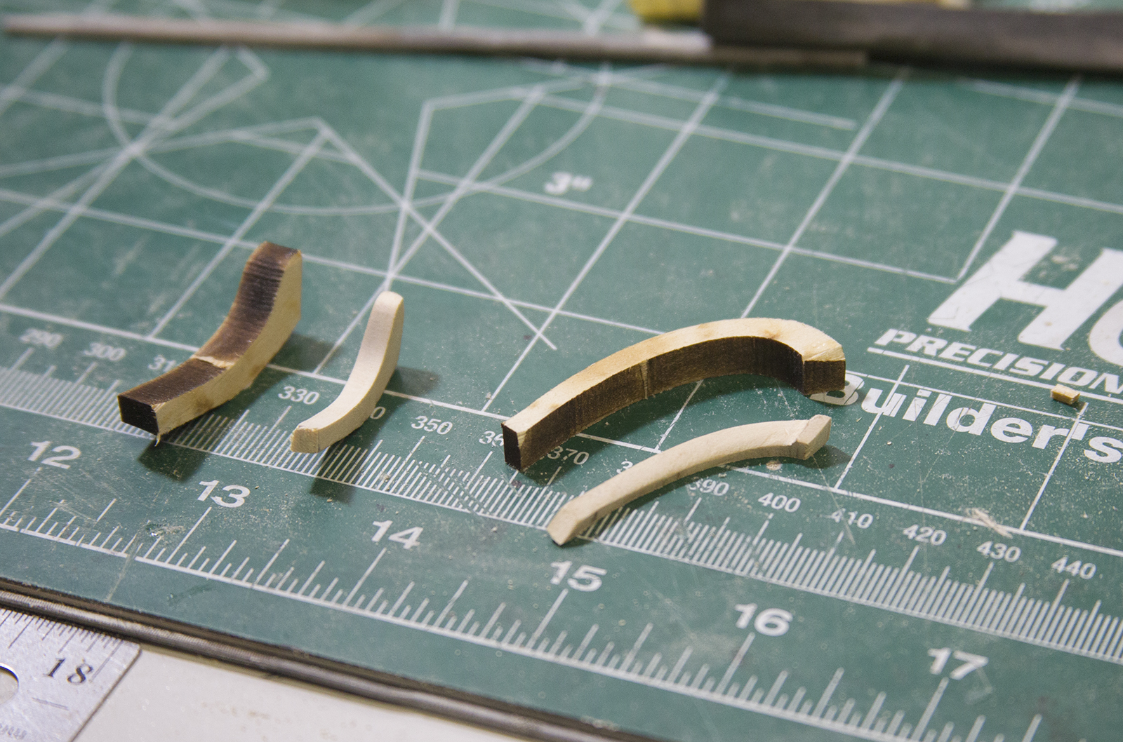 Next comes the delicate process of cutting out and fitting the catheads into position. The trick here is to cut out the rail smaller than necessary, then slowly file out and sand the slits until the catheads fit as snug as possible.