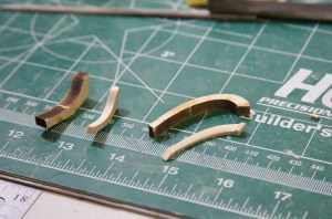 The risers (two strip along to side) are added as well as the “thwarts” or seats. Each of the seats is measured and ‘scored’ with a gouge along the edge. It was pretty tricky getting a good score along the edges of the seats. I wish I’d have taken a picture of it, but my method was to pinch sharp tweezers (you can actually see the tweezers I used in the photo below) together with a small piece of wood between them to keep the ends a consistent distance apart. Then I dragged one tip along the outside of the strip of I wanted to score as a guide – while using the other tip to score the wood.