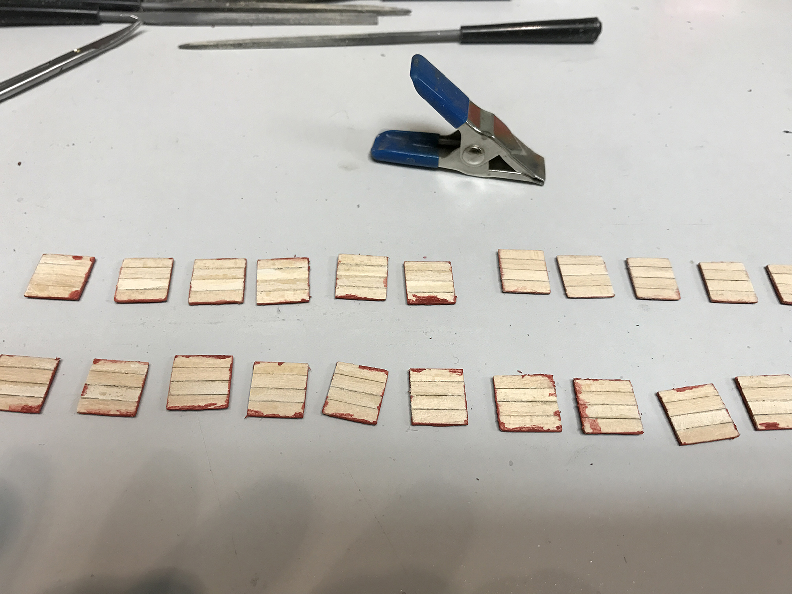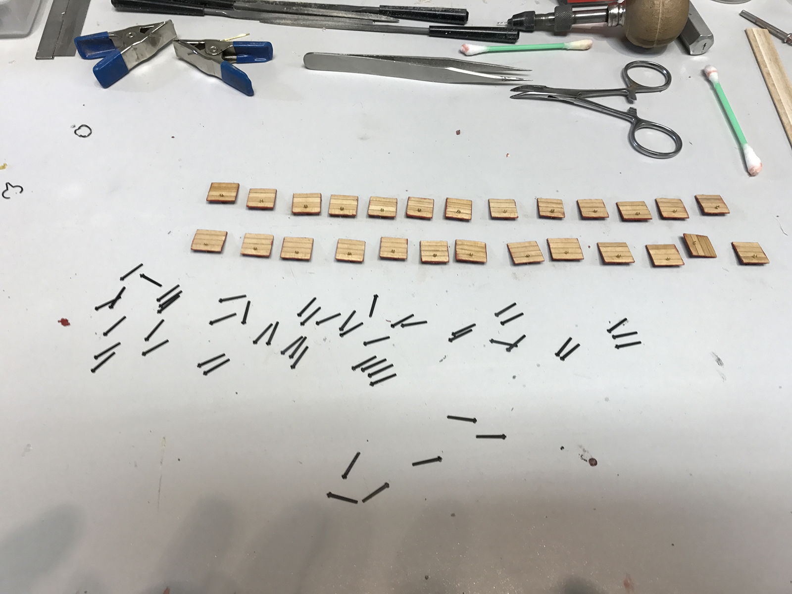 Next up – the gunport lids. I was initially confused as to the number of gunport lids that were required. There are 14 gunports on either side of the ship. Augie already had the most forward port closed off, with a cannon tied off on the deck. So initially – I planned for thirteen lids per side.