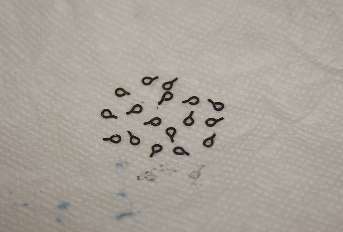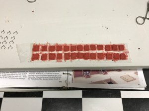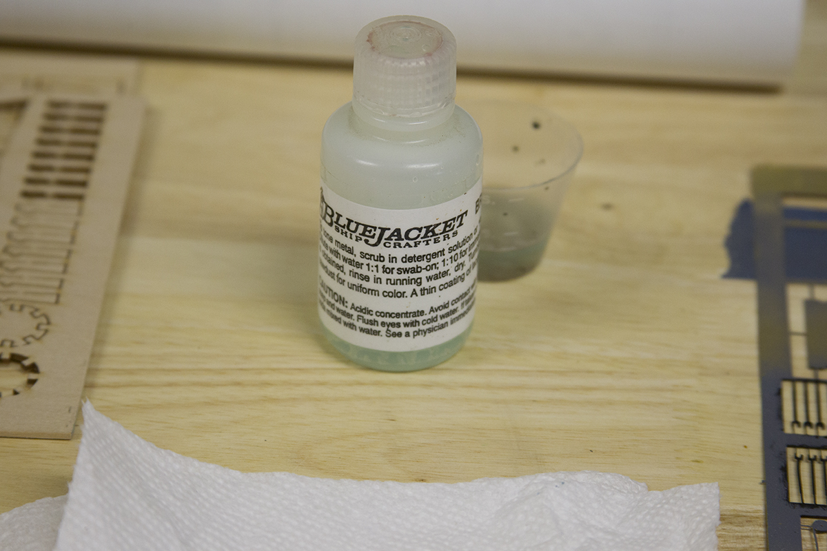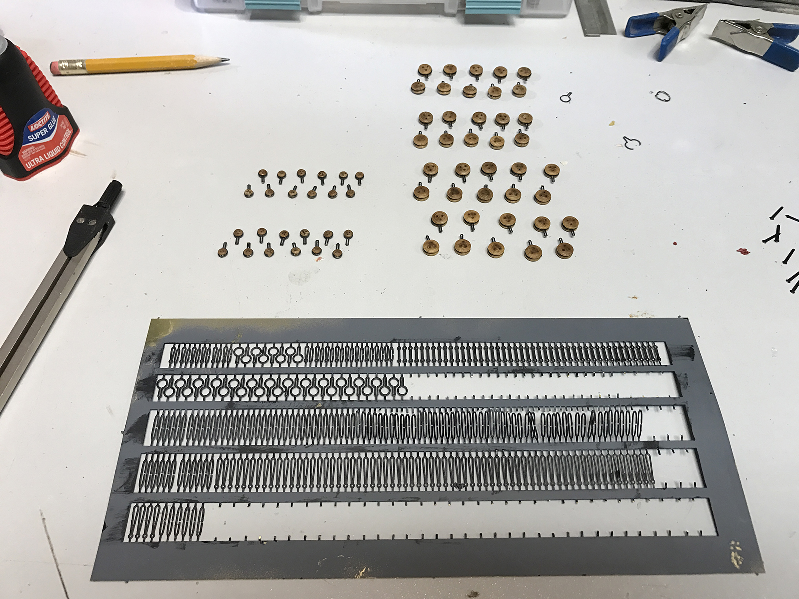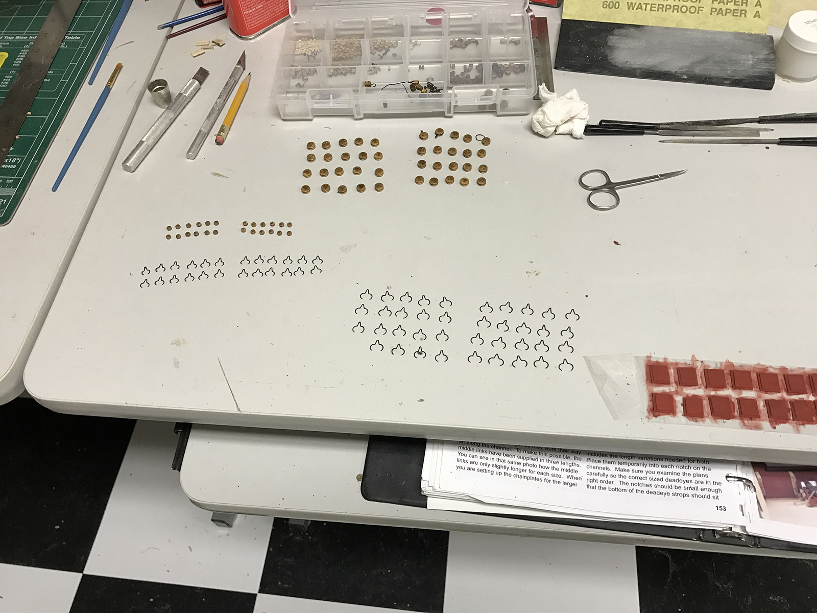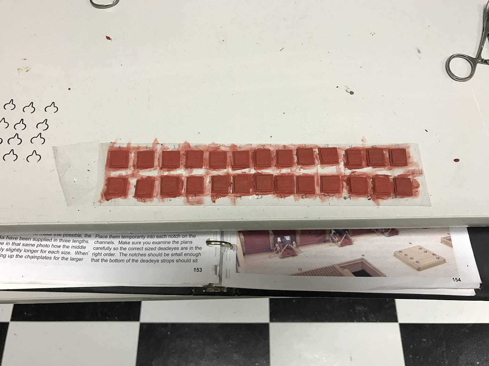 I began by prepping all of the deadeyes and parts (called strops) that will attached everything to the hull of the ship through the chainplates. While my first choice is to blacken all of the photo-etched parts to patina them, it was much more economical and efficient to just spray paint them.