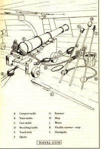 – The gun tackle – one rig on each side, used to haul the gun into its firing position after loading. (Letter C in the diagram below)