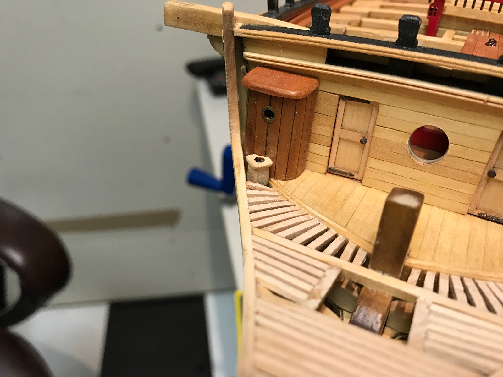The ship’s roundhouses were at the fore of the ship on the bow. The Confederacy’s Roundhouses seemed to be pretty straightforward, however Augie had written in his notes that he was intending to use the Swiss Pear instead of the lightwood indicated in the plans. I really liked this idea, as it would surely set off a bit of color on the bow of the ship. It really didn’t change how I approached the Roundhouses initially, but soon after I discovered the slightly thicker Swiss Pear was going to involve a little more intricate bit of beveling than the stock parts.