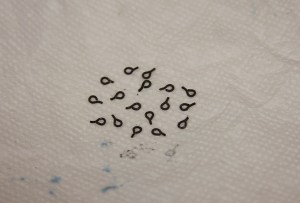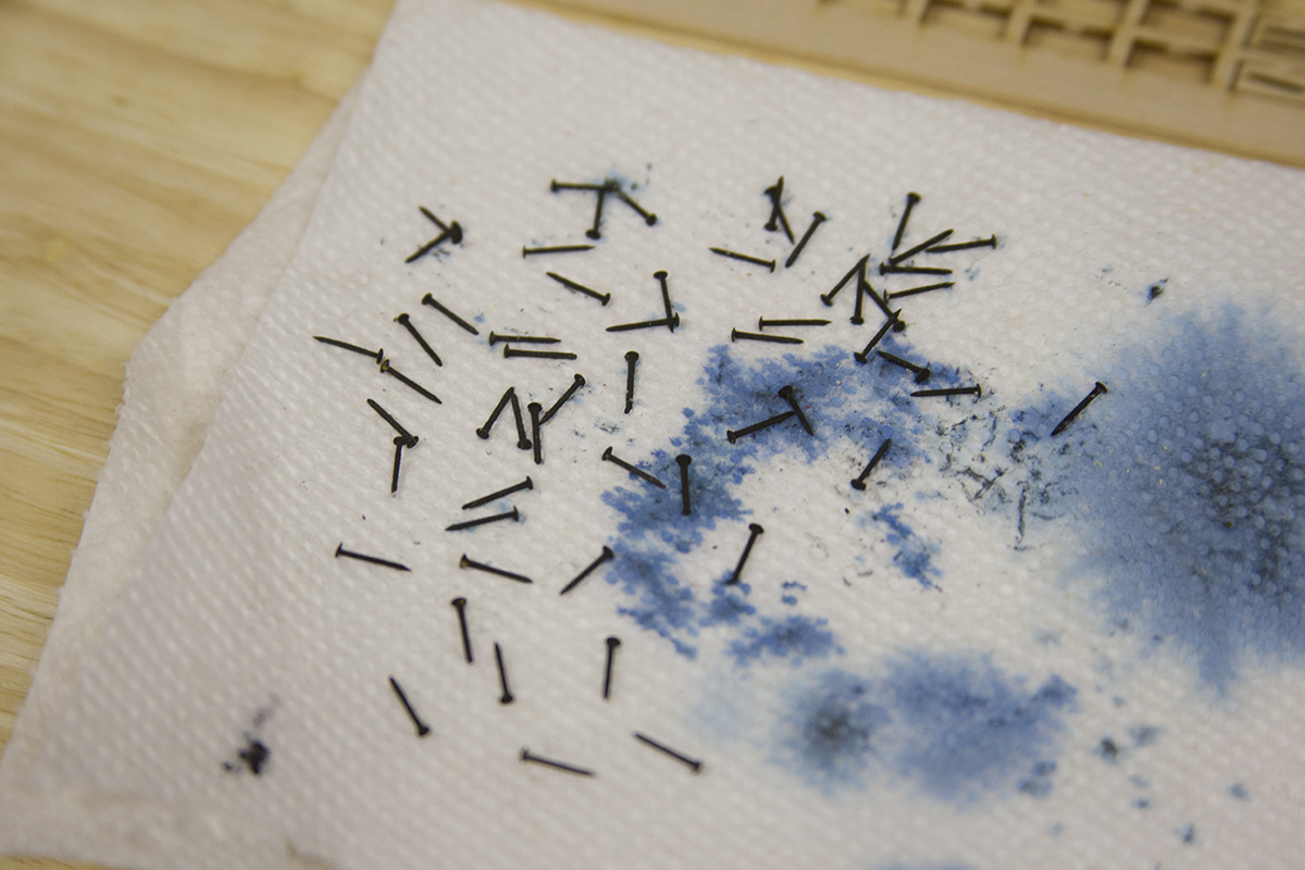 I did however choose to blacken the eyebolts and the nails using a 50/50 mixture of Bluejacket’s solution and water. The nails ended up darkening very nicely, but the eyebolts are sketchy at best. They’ll all require some touchups once everything is mounted.