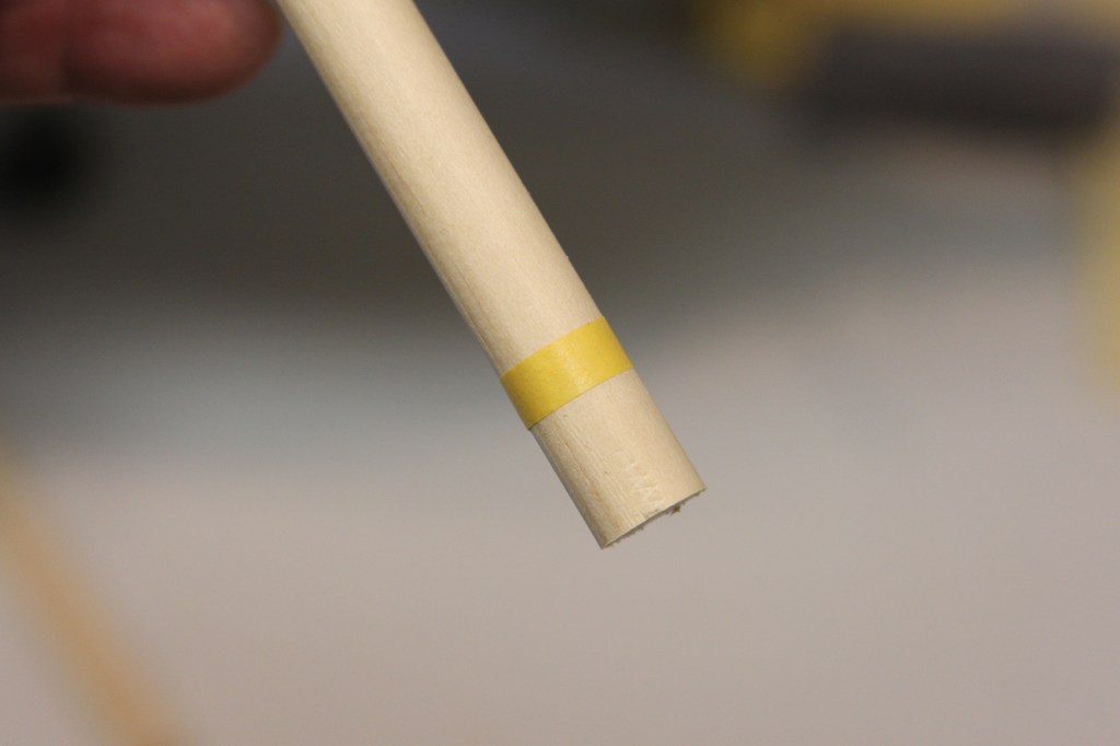 In order to get the cleats properly spaced, I used a thin strip of masking tape to measure the exact diameter of the dowel (after I did a little smoothing/sanding). I laid that strip onto my ruler, then equally divided it by the number of cleats needed. I then reapplied the tape to the mast, drilled the holes appropriately, and mounted the cleats.