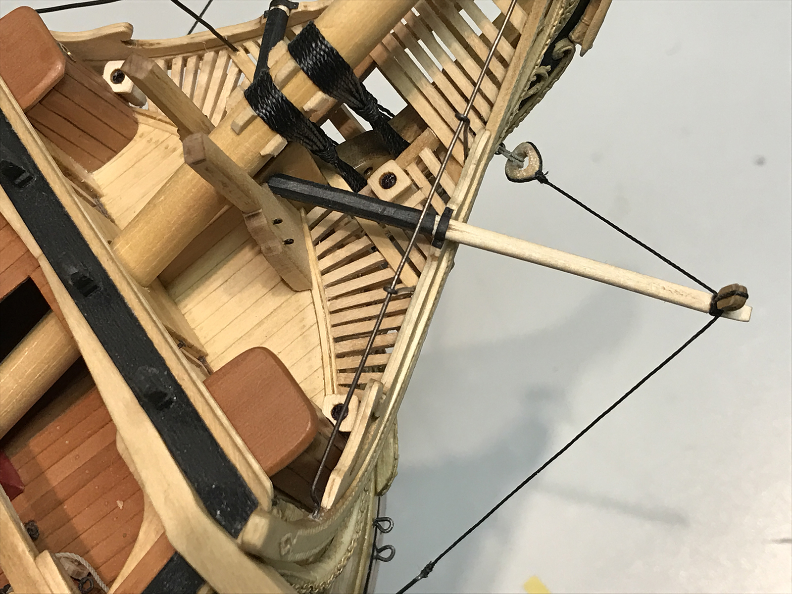 The two boomkins are shaped to meet the apex of the knightheads, then the inboard end is painted and mounted into place. They are accepted by notches in the false rails and held in place by a small capsquare. One single block is seized to the outer end of the boomkin and then secured to the hull using a triangular block.