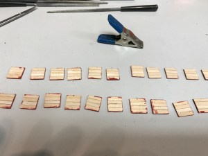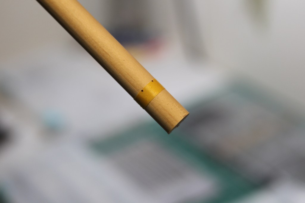 Once again – the recommendation for the bands is thick card stock. Instead, I increased the authenticity by using brass strips that are measured and blackened. Each strip is pretty difficult to glue in place and needs to be clamped securely.